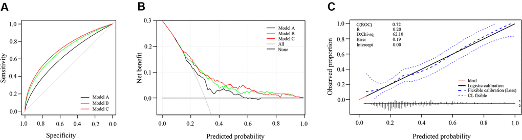 We constructed the following three diabetes risk assessment models: combination model (Model A) (including the noninvasive factors BMI, WC, body fat and DBP), combination + lipids model (Model B) (additionally including the invasive screening factors TC, TG and HDL-C) and combination + lipids + galectin-3/adiponectin model (Model C) (finally including galectin-3/adiponectin). These models’ discrimination could be confirmed by receiver operating characteristic (ROC) curve analysis (Figure 2A). ROC curve analysis showed that galectin-3/adiponectin had the best discrimination accuracy for diabetes, especially in Model 3 of group II when compared with adiponectin (area under curve (AUC)=0.712 [95% CI: 0.643–0.780]; P=0.056). The combination + lipids + galectin-3/adiponectin model (AUC = 0.72 [95% CI: 0.66-0.77]) displayed better assessed performance than the combination model and the combination + lipids model (AUC =0.64 [95% CI: 0.58–0.69] and AUC = 0.70 [95% CI: 0.65– 0.76], respectively). Meanwhile, net reclassification improvement (NRI) and integrated discrimination improvement (IDI) can also depict significantly improved assessed performance for the combination + lipids + galectin-3/adiponectin model (NRI=0.5481 [95% CI: 0.3486–0.7477], P<0.001; IDI=0.0957 [95% CI: 0.0616-0.1299], P<0.001) compared with the combination model, suggesting distinct model improvement. To explore their clinical utility for prediction errors in risk assessment models, we built a decision analysis curve for the assessment of three models. Compared with other models, the combination + lipids + galectin-3/adiponectin model had a higher net benefit over the whole range of threshold probability, the difference being sizeable and visible on the graph for values of probability between 0.15 and 0.65 (Figure 2B). Finally, the prediction results and diagonals of the combination + lipids + galectin-3/adiponectin model were basically coincident, which showed that the calibration curve had good concordance between the predicted probability and actual probability, with a mean absolute error of 0.024 (Figure 2C).