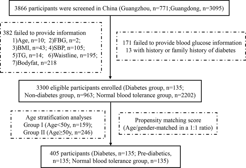 We performed a cross-sectional study in Guangzhou and Dongguan, China, from December 2018 to October 2019. Participants were recruited from the Sun Yat-sen Memorial Hospital of Physical Examination Center in Guangzhou and Dongguan communities (Dalingshan community, Zhangmu community, Daojiao community, Qiaotou community, Songshan lake community, Qingxi community, Zhang'an community and Meinian Physical Examination Center). During the recruiting phase, a total of 3866 residents who were Han ethnicity of the Chinese population, aged 18-70 years, and lived in those regions ≥3 years were invited to participate. Subjects who met the following criteria were excluded sequentially from the analyses: (1) pregnant women; (2) those who suffered from mental illness or severe physical diseases such as hepatic cirrhosis, chronic renal failure or evident cardiac insufficiency; (3) those with a history of infectious disease or malignant tumors; (4) those who were diagnosed with hypertension, hyperlipidemia, cardiovascular and cerebrovascular diseases; (5) those with other endocrine diseases; and (6) those who used drug or dietary supplements or functional food long term (≥3 times/week for more than 3 months). We further excluded participants who failed to provide blood glucose information (n=171) and with a history or family history of diabetes (n=13). In addition, individuals who failed to provide information (age, n=10; FPG, n=2; BMI, n=43; SBP, n=105; TG, n=14; WC, n=195 or body fat, n=218) were excluded.