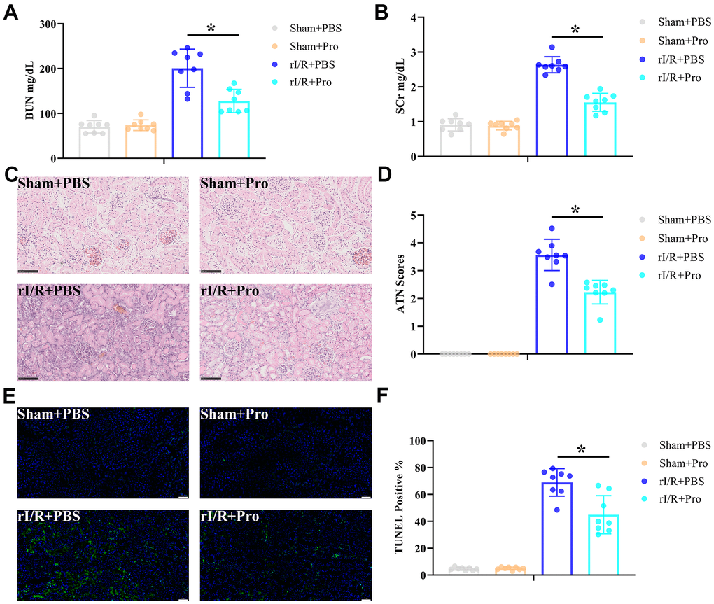 To ascertain that Pro confers protection against rI/R injury in vivo, Sprague Dawley rats were subjected to rI/R or sham surgery and infused, at the onset of ischemia and over the reperfusion stage, with PBS (vehicle) or Pro as described in Materials and Methods. Rats were sacrificed 24 h later and serum obtained for blood urea nitrogen (BUN) and serum creatinine (SCr) determinations. Results showed that Pro administration significantly reduced serum BUN (Figure 1A) and SCr (Figure 1B) levels in rats exposed to rI/R. In turn, H&E staining showed that Pro administration attenuated renal injury (Figure 1C) and resulted in lower ATN scores (Figure 1D) compared to rI/R+PBS treatment. Moreover, compared to the latter group, TUNEL staining revealed a significant reduction in apoptosis in kidney samples from rI/R+Pro-treated animals (Figure 1E, 1F). No obvious changes in serum markers, kidney histology, or apoptosis were noted in sham-operated rats that received PBS or Pro. These findings confirmed that Pro administration significantly lessened classical manifestations of rI/R injury in rats.