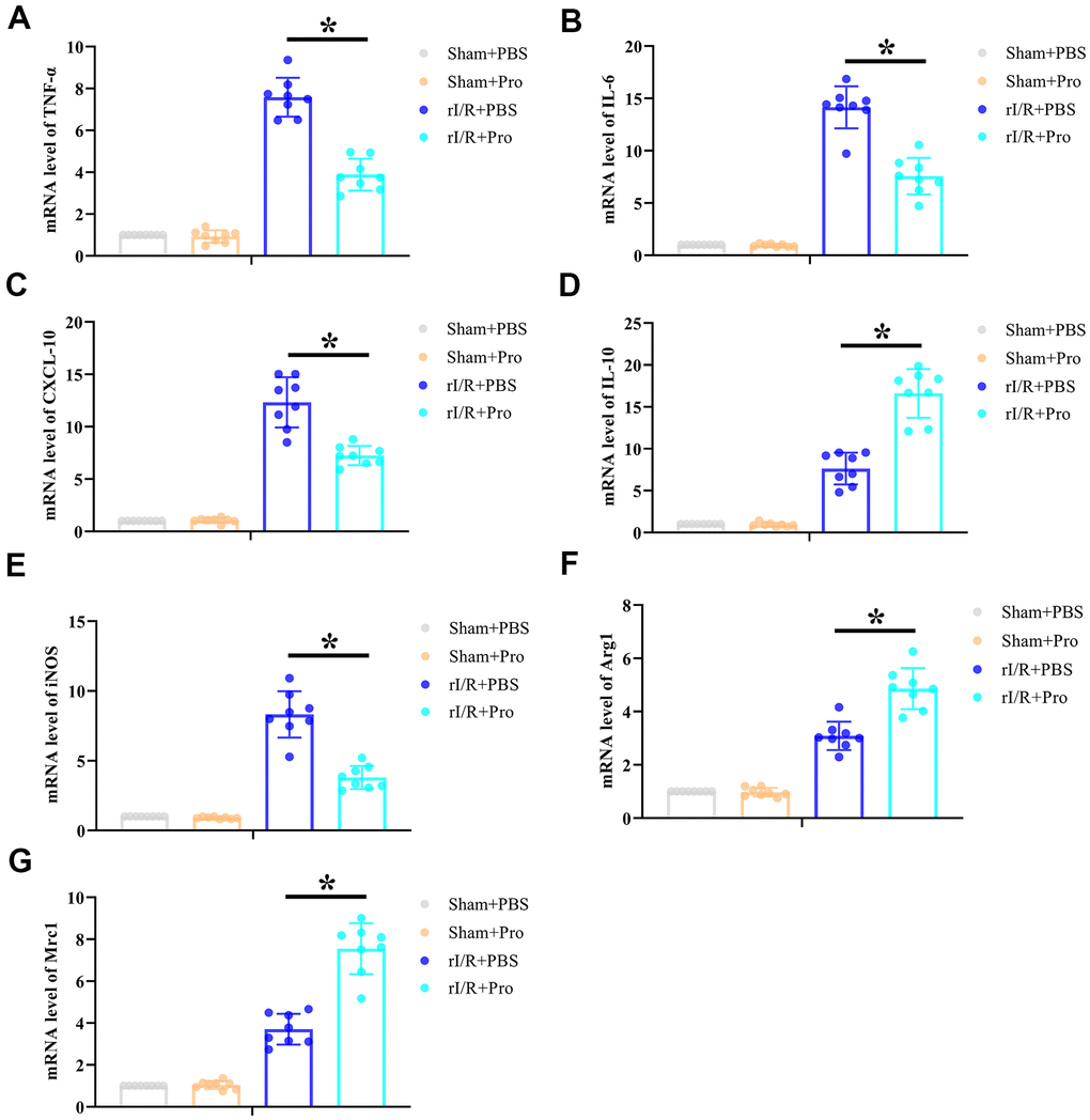The inflammatory immune reaction is a major determinant of rI/R injury. To evaluate whether the protective effect of Pro on kidney function and structure after I/R is associated with a reduced inflammatory response, renal expression of proinflammatory and anti-inflammatory cytokines was quantified by real-time PCR. As shown in Figure 2A–2D, rI/R significantly activated the production of IL-6, TNF-α, CXCL-10, and IL-10 mRNA. Suggesting a net anti-inflammatory effect, Pro administration significantly repressed proinflammatory CXCL-10, IL-6, and TNF-α mRNA levels (Figure 2A–2C) but enhanced instead anti-inflammatory IL-10 mRNA production (Figure 2D) in kidney samples from rI/R-challenged rats. Furthermore, Pro administration during rI/R reduced renal expression of iNOS, a marker of M1 macrophages (Figure 2E) and enhanced the expression of macrophage M2 markers Arg1 and Mrc1 (Figure 2F, 2G). In contrast, no significant changes in cytokine or macrophage marker expression were observed in sham-operated, control rats administered PBS or Pro. These results suggest that Pro protects the kidneys from rI/R injury by alleviating the inflammatory response and promoting M1-to-M2 transition in macrophages.