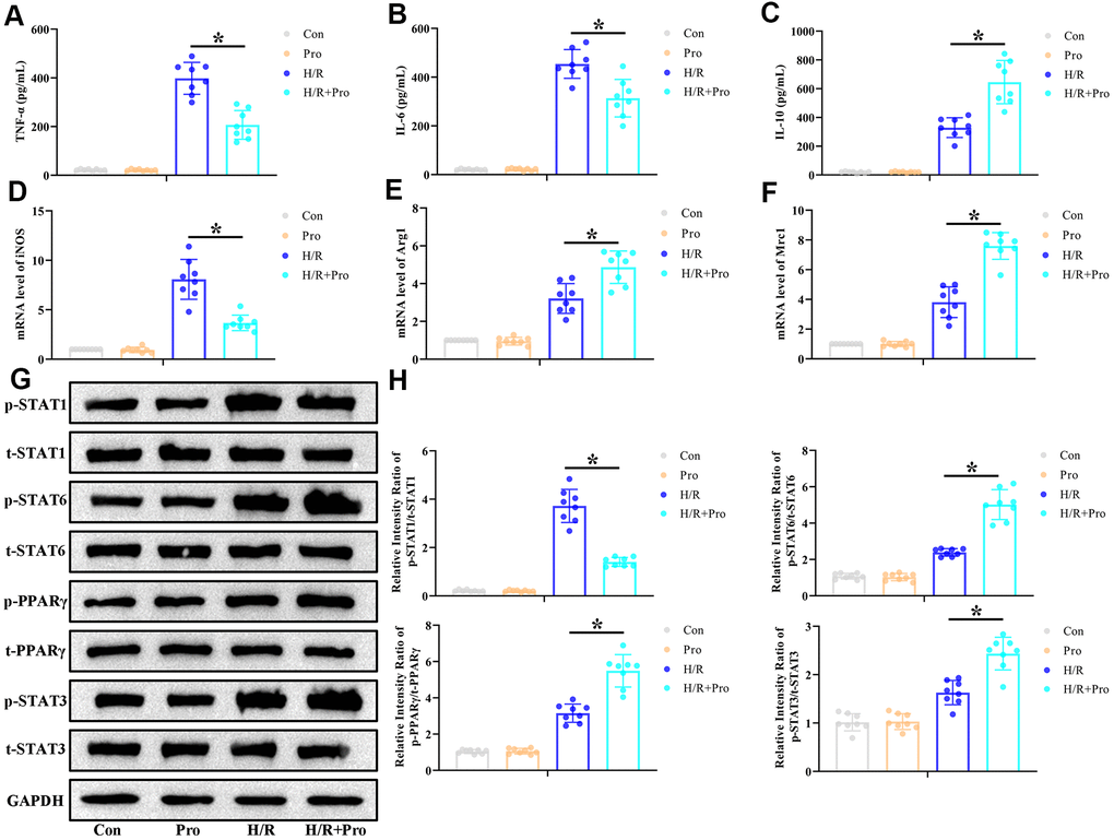 The critical influence of STAT3 and PPARγ activation in modulating macrophage M1/M2 phenotype conversion has been described in previous studies [20, 21]. Therefore, we conducted western blot assays to assess whether STAT3 and PPARγ expression in PMs is affected by exposure to Pro. We found that H/R increased p-STAT1, p-STAT3, p-STAT6, and p-PPARγ expression, whereas Pro incubation reduced p-STAT1 and increased p-STAT3, p-STAT6, and p-PPARγ levels in H/R-treated PMs (Figure 3G, 3H). Once again, in control, non-H/R-treated cells, Pro alone did not alter the expression of these proteins. These findings indicate that Pro activates STAT3 and PPARγ signaling in PMs exposed to H/R.