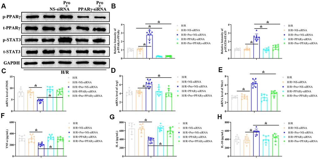 To investigate whether PPARγ/STAT3 signaling mediates the switch to the M2 phenotype induced by Pro in H/R-treated PMs, PPARγ expression was suppressed in these cells by transfection with PPARγ-directed siRNA. As indicated in Figure 4A, 4B, PPARγ siRNA efficiently repressed PPARγ activation in both control and Pro-treated cells and blocked STAT3 activation in Pro-treated PMs. Notably, PPARγ silencing also abrogated the effects of Pro on iNOS, Arg1, and Mrc1 expression, but did not affect their levels in PMs cultured without Pro (Figure 4C–4E). Also importantly, PPARγ depletion abrogated the reduction in pro-inflammatory IL-6 and TNF-α levels and the increase in anti-inflammatory IL-10 mRNA production induced by Pro (Figure 4F–4H). These findings suggest that Pro promotes polarization of H/R-challenged macrophages towards the M2 phenotype by enhancing PPARγ-mediated activation of STAT3.