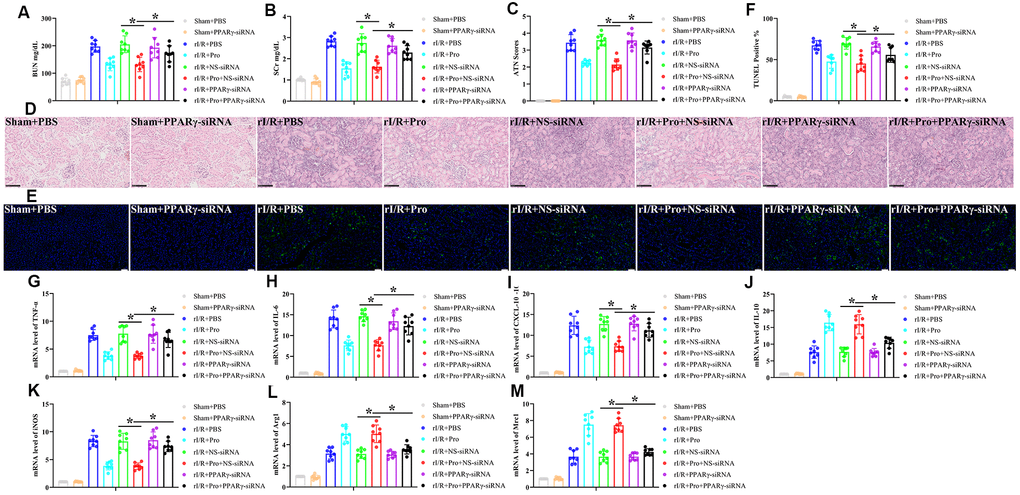 Finally, and to determine whether PPARγ activation is involved in the renoprotective actions of Pro against rI/R, we silenced PPARγ in vivo by administering a tail vein injection of a PPARγ siRNA premixed with mannose-conjugated polymers 4 h before rI/R surgery. Analyses carried out 24 h post-reperfusion indicated that PPARγ-siRNA treatment had no effect on sham rats but attenuated or abolished the renoprotective actions of Pro on rI/R-treated rats. This was evidenced by higher serum BUN and SCr concentrations, higher ATN scores for tissue samples, and increased numbers of TUNEL-positive cells compared to both rI/R+Pro and rI/R+Pro+NS-siRNA treatment groups (Figure 5A–5F). In addition, compared to the last two groups, PPARγ silencing significantly increased TNF-α, IL-6, and CXCL-10 mRNA levels and reduced IL-10 mRNA production in kidney samples from rats subjected to rI/R (Figure 5G–5J). Suggesting a critical role for Pro-mediated PPARγ activation in the conversion of renal macrophages to the M2 phenotype, PPARγ depletion in rI/R-treated rats prevented the decrease in iNOS and the increase in Arg1 and Mrc1 mRNA levels induced by Pro administration (Figure 5K–5M).