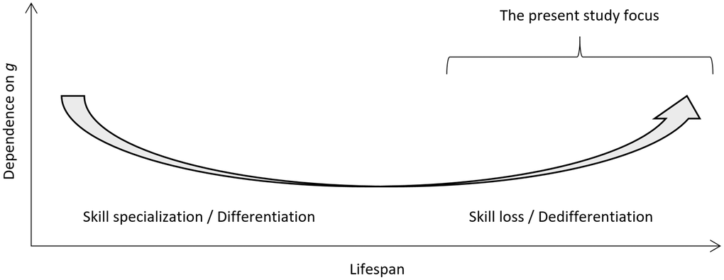 The age dedifferentiation hypothesis suggests that as humans age we become more reliant on general intelligence (g) for the different cognitive functions [1]. This is a somewhat contested idea in the geriatric field where it has been suggested that underlying pathology accounts for dedifferentiation [2]. Based on early research on dedifferentiation of cognitive abilities in later life, [3] this hypothesis suggests that the influence of g on cognitive test performance increases as the biological constraint that comes with old age renders specific cognitive abilities more similar [4]. When dedifferentiation is combined with the (i) known differentiation of cognitive functioning that occurs due to skill specialization from young age to adulthood, and (ii) stability of adult cognitive functioning from 18-65 years of age, [5] a conceptual U-type lifespan plot can be drawn (Figure 1) similar to Craik and Bialystok [6].