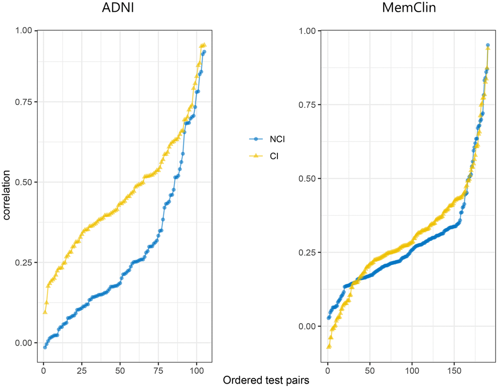 All informative test pair correlations (105 for ADNI; 190 for MemClin) sorted from weakest to strongest magnitude stratified by database and group are depicted in Figure 2 showing dedifferentiation by impairment in both datasets, i.e. generally stronger linear associations between test pairs among CI vs NCI patients (ADNI: mean inter-test r = 0.51 vs r = 0.33, p < 0.001) and MemClin: r = 0.31 vs r = 0.27, p = 0.042). We also see that the dedifferentiation pattern is more pronounced in ADNI compared to MemClin but present in both.