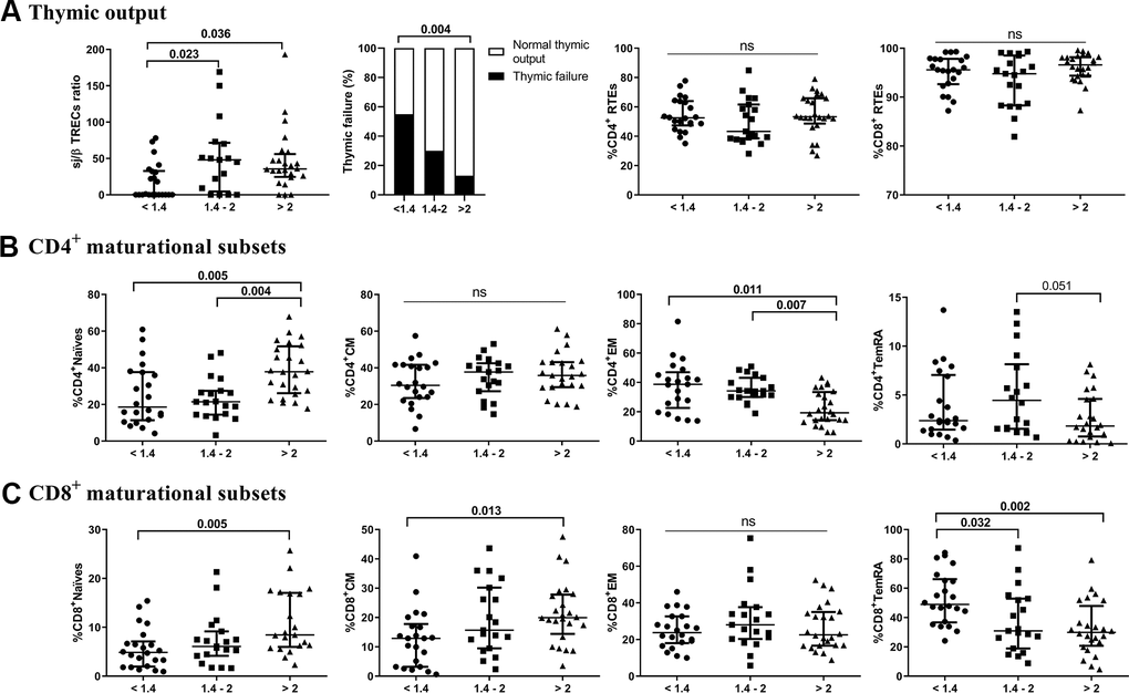 We first quantified the thymic contribution to the T-cell compartment (Figure 1A). The lower CD4/CD8 ratio group showed a significantly lower thymic output than both the intermediate and higher ratio groups (p=0.023 and p=0.036, respectively). Additionally, we found a positive correlation between sj/β TREC and the CD4/CD8 ratio (r=0.305; p=0.015). Interestingly, 54.5% of those in the lower CD4/CD8 ratio group presented thymic failure, with only 29.4% and 12.5% in the intermediate and higher ratio groups, respectively (p=0.009). Nevertheless, no significant differences among the groups regarding the total number of recent thymic emigrants (RTEs) or CD4 or CD8 T cells were found. We next explored the frequencies of T-cell maturational subsets among the study groups. Regarding CD4 T-cells (Figure 1B and Supplementary Table 1), we observed a decreased frequency of naïve cells in the lower and intermediate groups (p=0.005 and p=0.004, respectively), but a more mature phenotype, namely, EM cells, appeared to accumulate in these groups (p=0.011 and p=0.007). Subjects with lower and intermediate CD4/CD8 ratios also showed a reduced CD4 naïve/memory ratio compared to those with higher CD4/CD8 ratios (Supplementary Table 1). Regarding CD8 T cells (Figure 1C and Supplementary Table 1), we observed lower frequencies of naïve and CM cells in the lower group than in the higher group (p=0.005 and p=0.013, respectively). Nevertheless, the frequency of TemRA was increased in the lower group compared to both the intermediate and higher groups (p=0.032 and p=0.002, respectively). In this subset, we did not observe any significant differences in the CD8 naïve/memory ratio between the latter groups (Supplementary Table 1). Furthermore, no differences among groups in terms of double-negative (CD4-CD8-) or double-positive (CD4+CD8+) T-cells were observed (Supplementary Table 1).