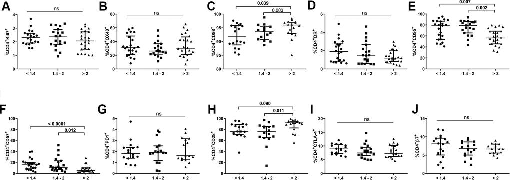 We also evaluated expression of different markers of proliferation (Ki67, OX40), metabolism (CD98), activation (HLA-DR), apoptosis-prone (CD95), senescence/exhaustion (CD57, CD28 and PD1), suppressive function (CTLA-4), and gut-homing imprinting (integrin β7) in the CD4 T-cell population (Figure 2). None of the comparison groups differed in terms of the frequencies of Ki67+, OX40+, HLA-DR+, PD1+, CTLA-4+ or integrin β7+ CD4+ T-cells. However, we did detect a significantly lower frequency of CD98+CD4+ T-cells, an energetic metabolism-related marker, in individuals with lower CD4/CD8 ratios than in those with higher ratios (93.5[88.7-95.7] vs. 96.0[92.9-97.0], p=0.039; Figure 2C). Notably, subjects with an intermediate ratio already exhibited similar values to those in the lower ratio group (93.6[90.7-95.6]). Individuals with lower and intermediate CD4/CD8 ratios also had increased frequencies of CD4+CD57+ T-cells and decreased frequencies of CD4+CD28+ T-cells compared to subjects with a higher CD4/CD8 ratio (16.7[8.5-20.2] and 10.6[6.6-21.8] vs. 5.0[3.5-10.1], p<0.0001, p=0.012, respectively, for CD57; Figure 2F; 76.4[71.1-89.1] and 76.1[65.1-85.5] vs. 92.2[82.8-95.0], p=0.090, p=0.011; respectively, for CD28; Figure 2H). In addition, a higher frequency of CD4+CD95+ T-cells in both the lower and intermediate groups than in the higher group was found (79.4[54.0-87.0] and 79.1[65.5-86.2] vs. 56.4[45.7-68.8], p=0.007 and p=0.002;, respectively; Figure 2E). Interestingly, CD95 expression was increased in all CD4 maturational phenotypes in the group with a lower ratio compared to that with a higher ratio (Supplementary Figure 1A) and was statistically significant in all cellular subsets, except for EM cells (naïve, p=0.042; CM, p=0.020; EM, p=0.069; TemRA, p=0.021; respectively).