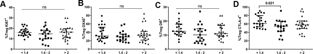 Regarding the Treg population (Supplementary Table 1), there was no difference in total pool of Tregs among the groups, though the lower group presented a higher frequency of the non-Treg subset defined by Miyara’s classification [22] than the higher group (p=0.045). Interestingly, a nonsignificant tendency in the effector Treg pool to be higher in subjects presenting lower CD4/CD8 ratios was observed (p=0.072). We next examined the frequencies of total Tregs expressing several markers previously described for CD4/CD8 ratios, and neither the lower nor intermediate CD4/CD8 ratio group differed significantly from the higher ratio group in terms of Ki67, HLA-DR, or OX40 expression (Figure 3). Nonetheless, subjects with lower CD4/CD8 ratios showed an increased frequency of CTLA-4-expressing Tregs compared to the intermediate group (61.0[53.5-78.7] vs. 54.6[42.9-65.9], p=0.021).