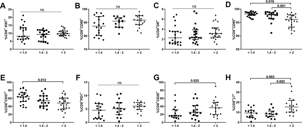 We also evaluated expression of the abovementioned biomarkers in the CD8 T-cell population of our cohort. As shown in Figure 4, subjects with lower CD4/CD8 ratios did not present any significant differences regarding expression of proliferation (Ki67), energetic metabolism-related (CD98), activation (HLA-DR), or apoptosis susceptibility (PD1) markers. However, we did find increased frequencies of CD8+CD57+ T-cells and decreased frequencies of CD8+CD28+ T-cells in the lower ratio group compared to those with a higher CD4/CD8 ratio (63.8[52.4-73.8] vs. 48.3[33.7-60.7], p=0.012 and 16.7[12.9-31.3] vs. 36.5[19.8-49.8], p=0.026; respectively; Figure 4E, 4G). Remarkably, we also detected a lower frequency of CD8 T-cells expressing integrin β7 in individuals with lower and intermediate CD4/CD8 ratios than in those with higher ratios (9.3[5.0-12.0] and 8.4[5.7-11.2] vs. 15.3 [10.3–21.8]; p=0.003 and p=0.002, respectively; Figure 4H). We also observed an increased frequency of CD8 T-cells expressing CD95 in the lower and intermediate CD4/CD8 ratio groups compared to the higher ratio group (98.2[97.6-98.8] and 98.0[96.5-98.7] vs. 96.2[93.3-97.8]; p=0.016 and p=0.001, respectively; Figure 4D). Similar to the CD4 subset, CD95 was highly expressed in all CD8 T-cell maturational subsets, except for EM cells, with differences between subjects having lower and higher CD4/CD8 ratios, where a trend was also observed, although nonsignificant (naïve, p=0.003; CM, p=0.009; EM, p=0.099; TemRA, p=0.008; Supplementary Figure 1B).