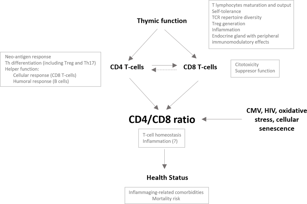 In summary, we report immunological features, mostly involving T-cell homeostasis, beyond CD4/CD8 ratio values in the elderly and novel evidence of the relevant role that the thymus may play in maintaining a healthy condition. Lower CD4/CD8 ratio values reflect alterations not only in CD8 T-cells but also in CD4 T-cells that seem to contribute to a permanent mildly activated state, probably by compromising an appropriate immune response and contributing to inflammation. Our findings may help in identifying novel therapeutic targets to improve the quality of life of the elderly, as favoring normal values of the CD4/CD8 T-cell ratio might improve vaccine responses and reduce the risk of infection, such as that by the novel SARS-CoV-2 virus, as well as the risk of cardiovascular disease and cancer.