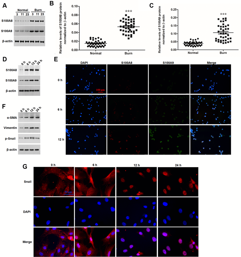 Firstly, expression of S100A8 and S100A9 proteins was detected in burned and matched normal skin tissues. The results showed S100A8 and S100A9 were both significantly upregulated in post burn skin (Figure 1A–1C). Then, epidermal keratinocytes were isolated from normal human skin, the purity of which were confirmed by FACS assay based on the dual luciferase labels of keratinocyte surface markers CK-14 and p63 (Supplementary Figure 1). Heat-stimulation was applied to treat the keratinocytes in vitro for simulating a state of burn injury. Western blotting and double immunofluorescence analyses showed that S100A8 and S100A9 were also significantly upregulated in response to heat stimulation in a time-dependent manner (Figure 1D, 1E). EMT and invasive growth have been recognized as the cellular pathological basis of scar formation after burn. Here, we found that the expression of EMT marker proteins α-SMA, vimentin and p-Snail were significantly induced by heat stimulation, which displayed a synchronous change with S100A8/A9 proteins (Figure 1F). Moreover, as a key regulator of EMT, the nuclear translocation of Snail protein was also induced synchronously (Figure 1G). These data above suggested that S100A8/A9 may be associated with EMT of keratinocytes post heat stimulation.
