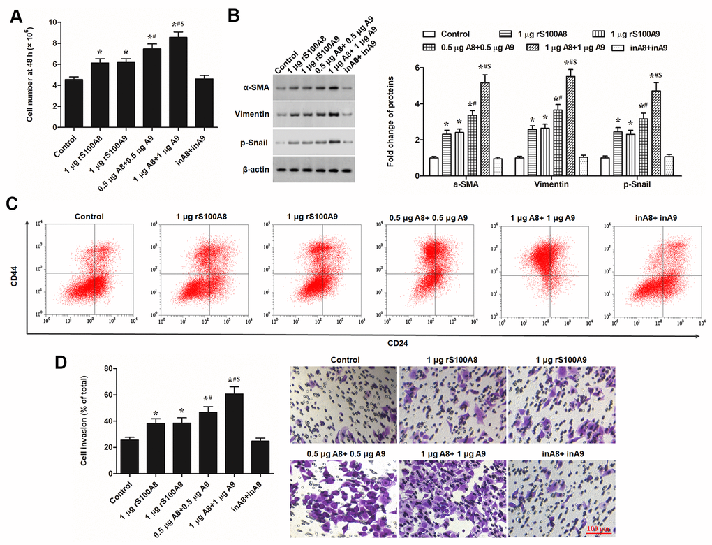 S100A8 and S100A9 had a positive effect on cell migration and caused a fibroblast-like phenotype in keratinocytes. These signs suggested that that S100A8 and S100A9 caused a transformation from the epithelial phenotype to mesenchymal phenotype in keratinocytes. In this study, we investigated whether S100A8 and S100A9 were involved in EMT keratinocytes. Human recombinant S100A8 and S100A9 proteins (rS100A8 and rS100A9) were incubated with epidermal keratinocytes in vitro, and heat-inactivated rS100A8 and rS100A9 were used as the negative control to rule out endotoxin effects. We found that treatment with 1 μg of rS100A8 or 1 μg of rS100A9 alone moderately stimulated cell proliferation (Figure 1A) and invasion (Figure 1D), and expression of EMT marker proteins including α-SMA, vimentin and p-Snail (Figure 1B), while treatment with 0.5 μg of rS100A8 plus 0.5 μg of rS100A9 had a greater promoting effect on cell activity and expression of EMT marker proteins than those of treatment with 1 μg of each recombinant protein alone (Figure 1A, 1B, 1D). Moreover, treatment with 1 μg of rS100A8 plus 1 μg of rS100A9 had a distinctly promoting effect on cell activity and expression of EMT marker proteins, but heat-inactivated rS100A8/A9 had no effect on cell phenotypes and protein expression (Figure 1A, 1B, 1D). To further verify the effect of rS100A8/A9 on EMT of keratinocytes, FACS approach was used to calculate the proportion of CD44+CD24- cells in response to treatment. The results showed that the proportion of CD44+CD24- cells was increased by the treatment of either rS100A8 or rS100A9 and further increased by co-treatment of rS100A8 plus rS100A9, which was consistent with the changes of cell invasion and levels of EMT marker proteins (Figure 2C). These data revealed that S100A8 and S100A9 synergistically promote EMT of keratinocytes.