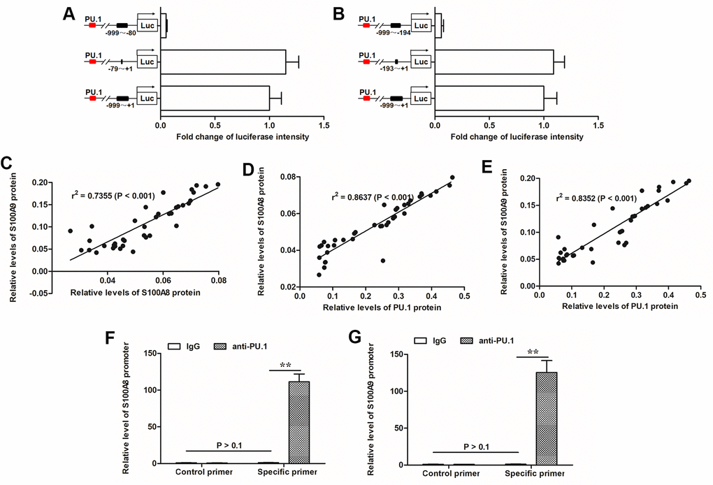 Luciferase reporter gene assay was used to evaluate the transcription regulatory activity of PU.1 on S100A8/S100A9 genes. Vectors containing different truncated promoter sequences were cloned and inserted into pGL3-basic vector (Promega, Madison, WI, USA) with PU.1 at the upstream. The assay was performed according to the manufacturer’s instructions.