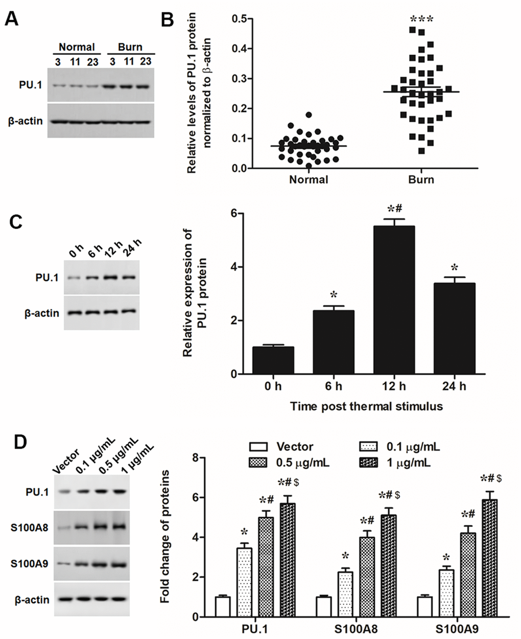 Clean-grade wild type (WT) and skin-specific PU.1 knockout (PU.1-/- or ΔPU.1) BALB/c mice (about 20 g) were purchased from Laboratory Animal Center, Shanghai Institutes for Biological Sciences (Shanghai, China). For the generation of ΔPU.1 mouse, in brief, keratin14-CRE transgenic tool mice and PU. 1 conditional knockout (PU.1loxp/loxp) mice mated two generations to obtain the mice with PU. 1 gene specific deletion in keratinocytes from embryonic day 14.5. After adaptive feeding for two weeks, deep second-degree experimental burn model was established: mice were intraperitoneally injected with 7% chloral hydrate, and the injection volume was 5 mL/kg. After successful anesthesia, hair on the back of the mice was removed to expose the skin, and then sterilized with 75% ethanol. Then the back of the mice was contacted with a 92° C -copper cylinder with 1.5 cm bottom diameter for 4 s, resulting in burn wound. Adeno-associated-viral vectors delivering S100A8 or/and Ad-S100A9 were locally injected into the epidermis at 24 h before burn. After the burn wound of the mice was healed, the formation of scar on the back of the mice were observed regularly. Until the scar height increases no more, the mice were sacrificed, and the keloids were carefully obtained for measurement of the scar thickness at the lowest and highest sites, the scar volume, and the content of total collagens. And skin tissues (with an area of ~1 cm2) were collected for histological examination with HE staining) and expression of related proteins with Western blotting.