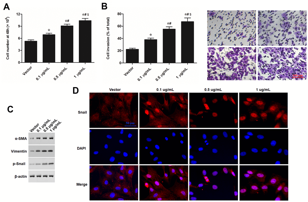 Like expression patterns of S100A8 and S100A9, PU.1 was significantly upregulated in burned skin tissues and thermal-stimulated keratinocytes (Figure 4A–4C). Moreover, overexpression of PU.1 promoted expression of S100A8 and S100A9 (Figure 4D), cell proliferation and invasion (Figure 5A, 5B), expression of EMT marker proteins (Figure 5C), as well as the nuclear translocation of Snail (Figure 5D) in a dose-dependent manner. These data demonstrated that PU.1 was a transcription factor of both S100A8 and S100A9, and it played a promoting role in EMT of keratinocytes.