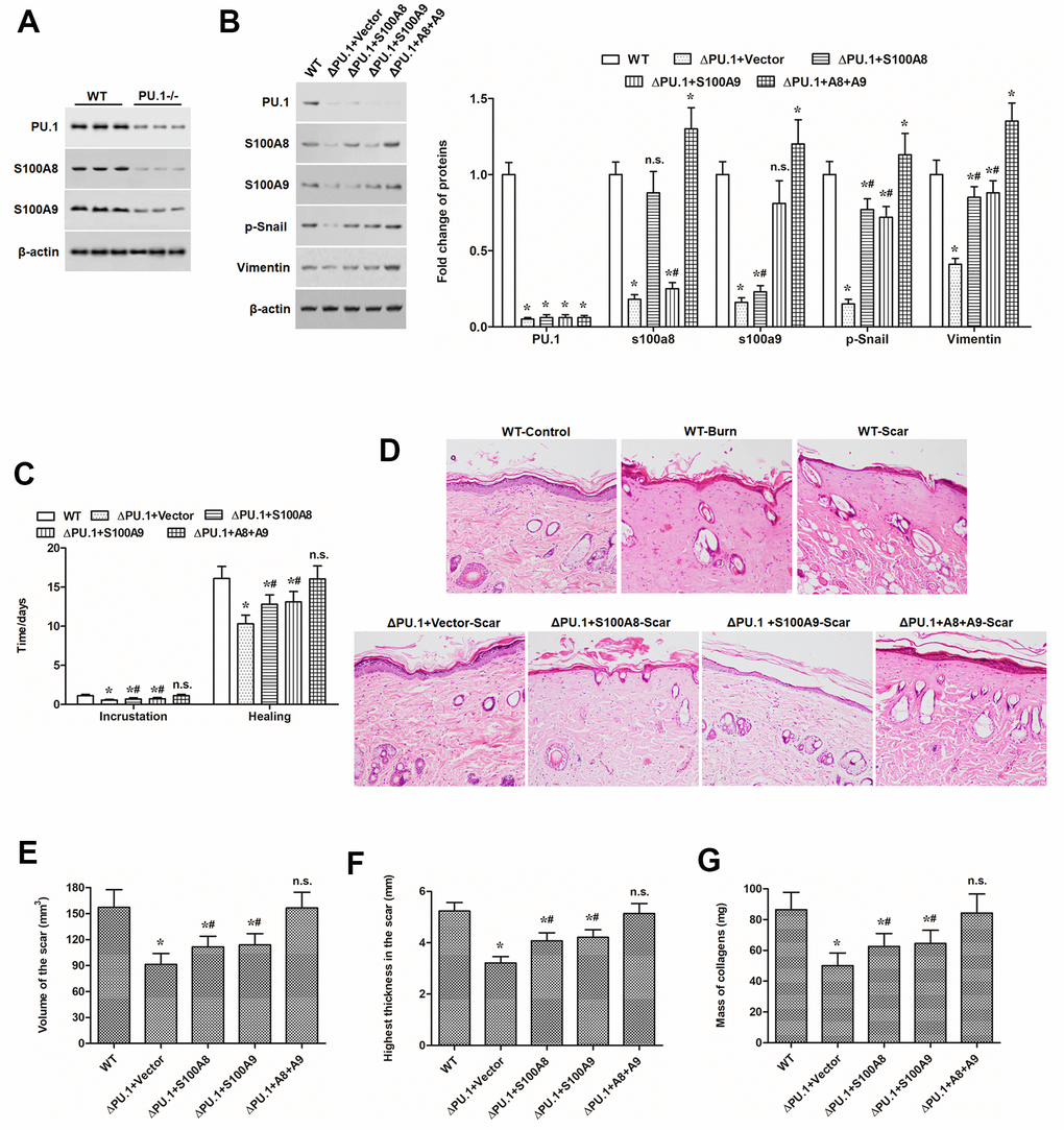 PU.1-/- displayed lower ability of scar formation, and s100a8 and s100a9 promoted scar development in PU.1-/- burn model mice