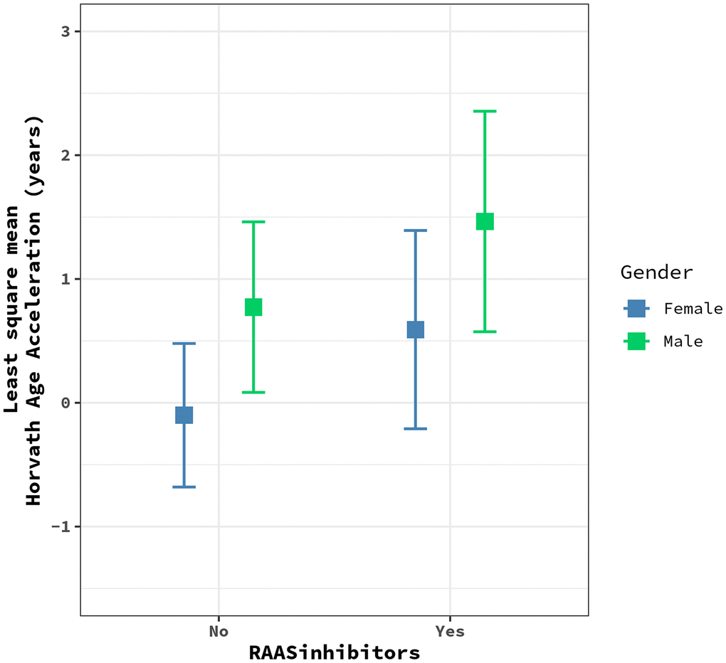 The interaction between use of RAAS inhibitors and sex on HorvathAA was significant after Bonferroni correction. The adverse effect of RAAS inhibitors on HorvathAA was only observed in males. Angiotensin-converting enzyme inhibitors (ACEI) and angiotensin receptor type I blockers (ARB) are two major inhibitors of the RAAS that are used as the first line of antihypertensive therapy in patients with kidney disease. They reduce the overactivity of the RAAS that is associated with the development of hypertension, CVD, and kidney disease. Differences in the RAAS between men and women may be modulated by sex hormones [50, 51], and the efficacy of RAAS treatment varies between sexes [52, 53]. The aging process increases angiotensin II, the primary effector molecule of the RAAS, and may upregulate the RAAS. This suggests the need for different RAAS therapies for the elderly [54]. More studies of the relationship between the RAAS, RAAS inhibitors, and the cellular aging process may help to improve RAAS therapies for elderly patients.