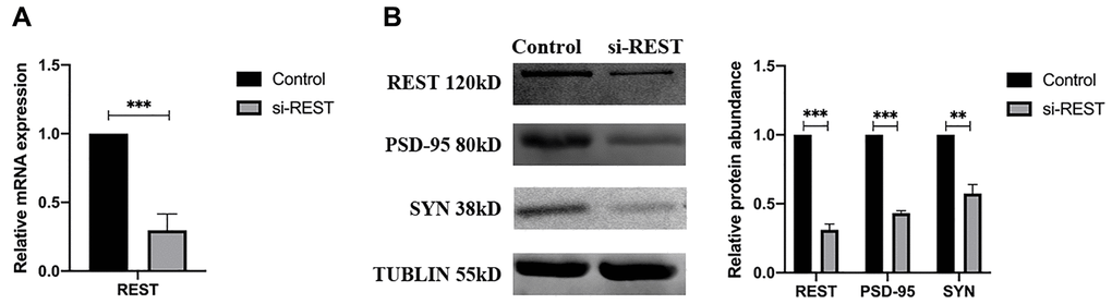 The primary mouse hippocampal neurons were separated from neonatal C57BL/6 mice and then transferred with REST siRNA. The successful knockdown of REST was verified by qPCR (Figure 2A). To clarify the phenotypes of synaptic plasticity, western blotting was performed. Results showed that the expression of synaptophysin (SYN) and PSD-95 (two synaptic biomarkers) was reduced significantly after the knockdown of REST (Figure 2B).