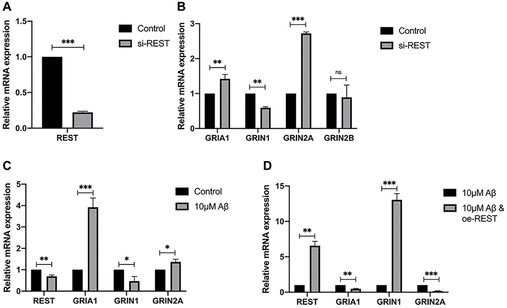 The REST expression was knocked down in SH-SY5Y cells, aiming to verify the results of ENCODE and explore the genes regulated by REST (Figure 3A). qPCR results showed that REST knockdown reduced the mRNA expression of GRIN1, but increased the mRNA expression of GRIA1 and GRIN2A (Figure 3B). Then, cells were incubated with 10 μM Aβ for 48 h. After REST knockdown, the mRNA expression of GRIN1 decreased but that of GRIA1 and GRIN2A increased (Figure 3C). Moreover, the GRIN1 mRNA expression was rescued after over-expressing REST (Figure 3D).