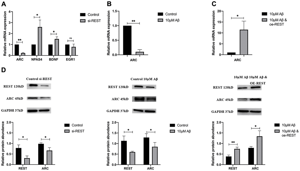 IEGs are also related to synaptic functions. In our study, the mRNA expressions of IEGs were detected in SH-SY5Y cells after the REST knockdown. Results indicated that REST knockdown could improve the mRNA expression of NPAS4 and BDNF (Figure 4A), which was consistent with previous findings [9]. In addition, the ARC mRNA expression decreased in the case of REST knockdown (Figure 4A). Aβ treatment also declined the ARC mRNA expression in SH-SY5Y cells, which could be rescued by over-expressing REST (Figure 4B and 4C). The ARC protein expression showed a similar trend to its mRNA expression (Figure 4D).