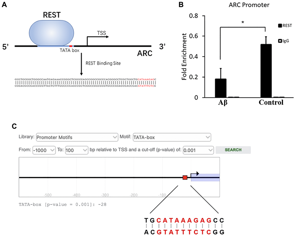 ChIP-PCR was performed in SH-SY5Y cells, aiming to investigate the interaction of REST and ARC. Results showed a REST-binding site at -75 to -19 bp of ARC gene (Figure 5A). After Aβ treatment, the combination between REST and ARC reduced as compared to that in the control group (Figure 5B). In addition, the ARC sequence was analyzed in the Eukaryotic Promoter Database (EPD, https://epd.epfl.ch/index.php), and results showed a TATA box at -28 bp of ARC gene (Figure 5C). We speculated that REST might influence TATA-box on the ARC gene, thus initiating its transcription to directly activate the ARC expression.