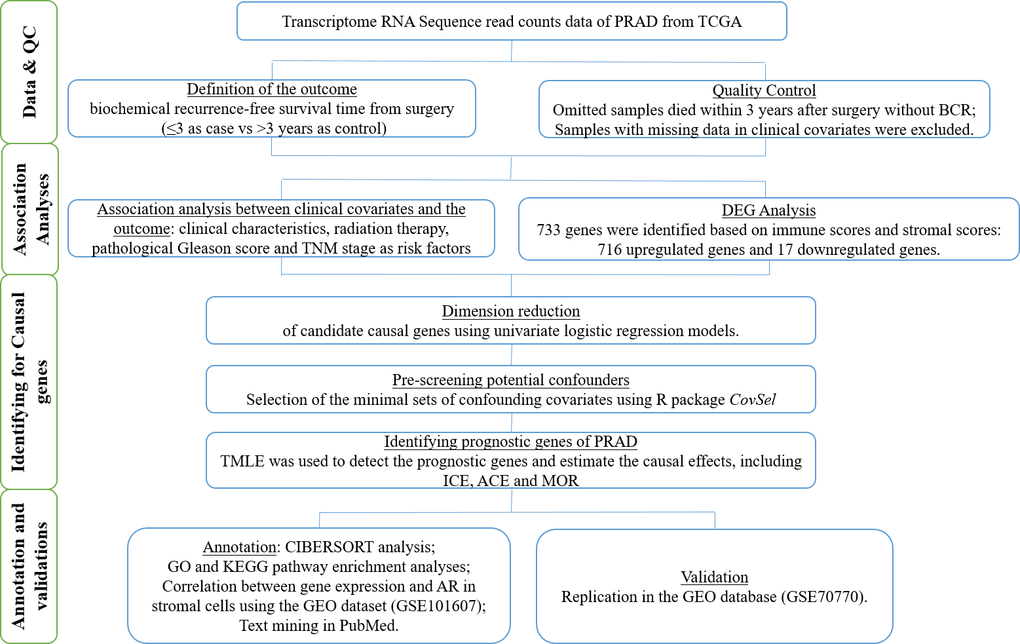 We accordingly obtained an adult PRAD patient dataset from TCGA project to identify the potential prognostic genes that were related to the TME and caused BCR at 3 years after prostatectomy. Moreover, the causal effects of these genes were estimated for individual therapies. We verified these prognostic genes using the Gene Expression Omnibus (GEO) database. We drew a workflow schematic to illustrate the entire study design for the identification of the prognostic biomarkers in PRAD (Figure 1).