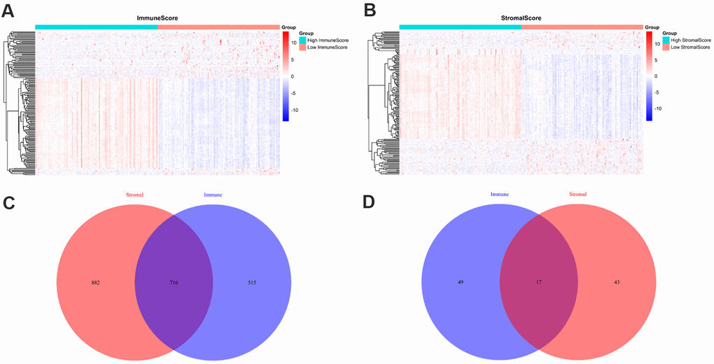 To identify the differentially expressed genes (DEGs), we divided the 209 PRAD patients to high and low score groups according to their immune and stromal scores. A total of 112 patients (53.59%) had high stromal scores, and 115 (55.02%) had high immune scores. Based on immune scores, 515 gene expression levels were demonstrated to be increased and 49 genes were decreased in the high score group as compared to the low score group (Figure 2A). Similarly, for the high and low groups based on stromal scores, 882 genes were increased and 43 genes were decreased (Figure 2B). log2|fold change| > 1 and False discovery rate (FDR) < 0.05 were used as the criteria for screening DEGs. Moreover, the Venn diagrams (Figure 2C, 2D) showed that 716 genes had high expressions in both high immune and stromal score groups, and 17 genes had low expressions. These overlapped DEGs (733 genes in total) might be the determinants of TME status. Thus, we decided to focus on these DEGs for all subsequent analyses.