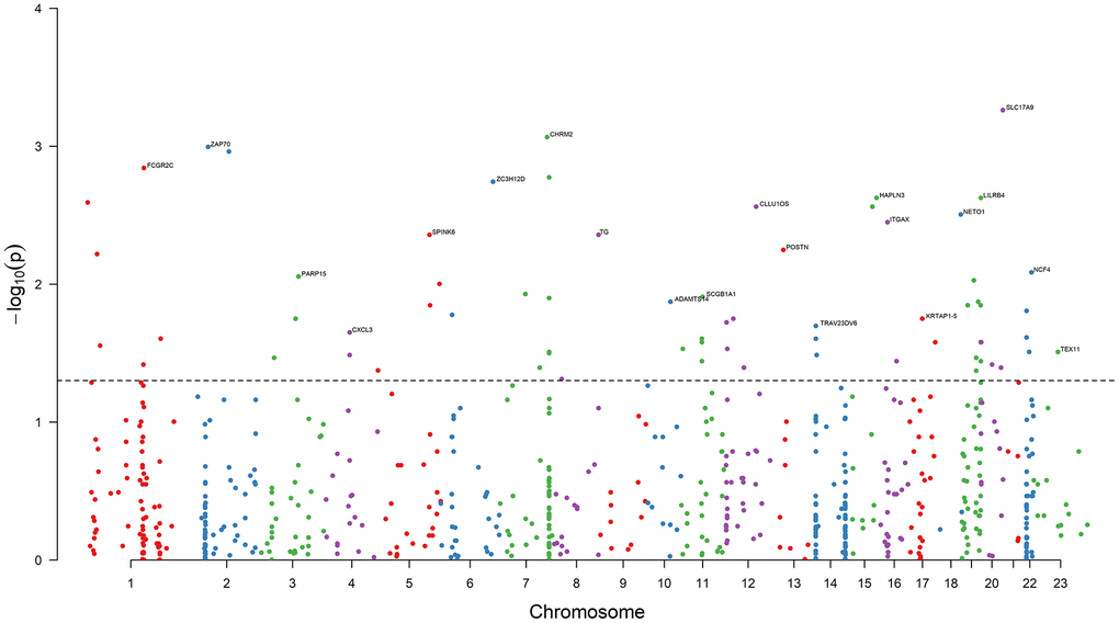 Among the 14 identified prognostic genes, 6 genes (TNFRSF4, ZAP70, CXCL5, CHRM2, CTSG, and IGLV3-22) were reported to be associated with promoting antitumor immunity in previously published papers, 4 genes (SPINK6, POSTN, CLLU1OS, and CEACAM7) were associated with the metastasis of tumor cells, and 4 genes (ERMN, SLC6A18, TG, and NETO1) were associated with other diseases.