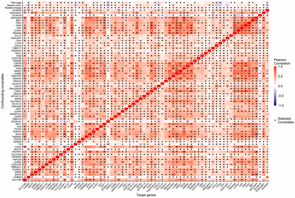 We considered the 68 associated genes along with 3 significant clinical covariates (radiation therapy, pathological Gleason score, and TNM stage) as the candidate confounding covariates. To reduce the dimension of confounding covariates for improved causal effect estimations, we selected the minimal sets of confounders between each candidate causative gene and BCR status using the R package, CovSel. WG is a subset of the candidate confounding covariates that leads to other covariates after removing WG conditionally independent of the outcome Y given WG. WG is illustrated in Supplementary material (Supplementary Figure 1). VG is a subset of WG after removing variables conditionally independent of the target gene G given VG. Figure 4 shows the Pearson correlation coefficients (displayed in color from dark blue to red as correlations from -1 to 1) of the 68 candidate genes and the corresponding 70 candidate confounding covariates of each gene, as well as the selected confounding covariates VG for each candidate gene (the dark dot of each column).