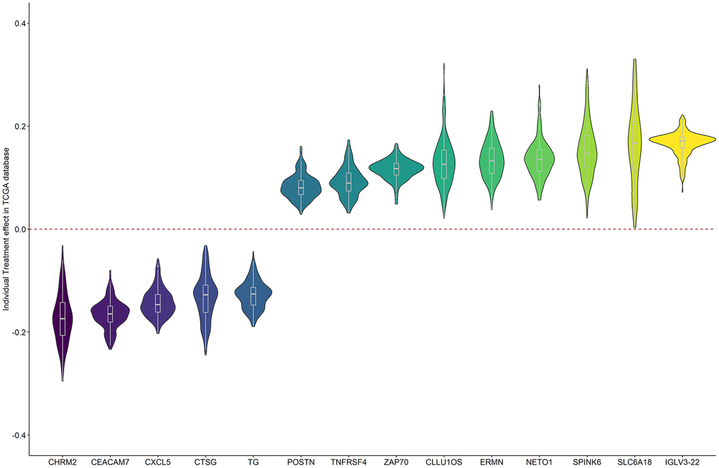 Figure 5 shows the individual treatment effects of each prognostic gene on BCR. The unfavorable genes were a risk for all patients, but with a range of positive causal effects. Similar results were obtained for the favorable genes.