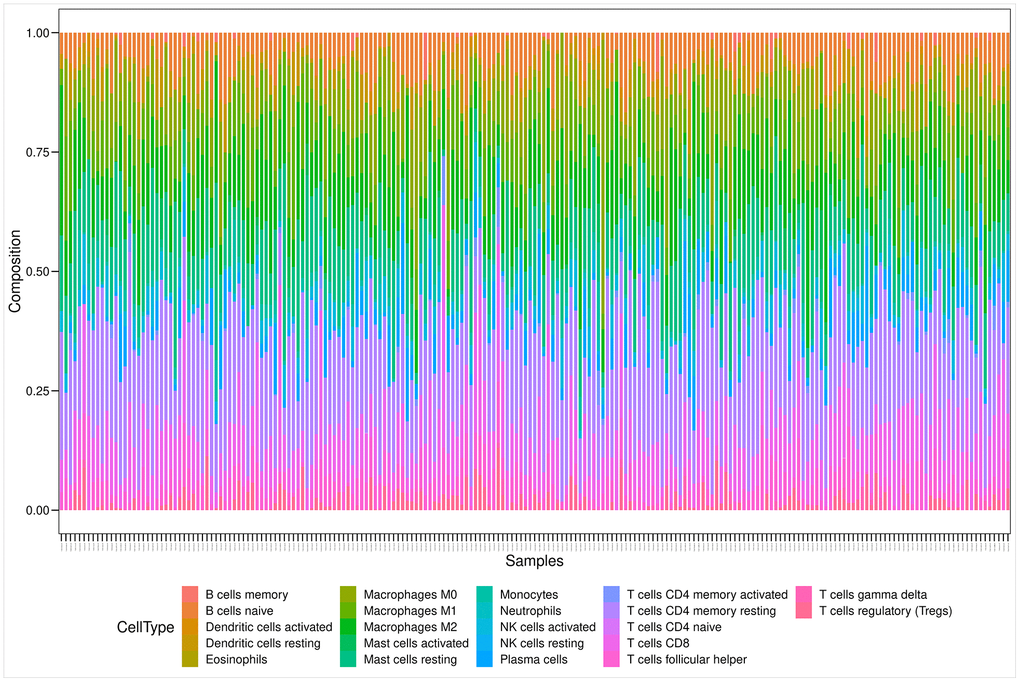 Figure 6 illustrates the estimated proportion of tumor-infiltrating immune components in the PRAD samples using the Cell-type Identification By Estimating Relative Subsets Of RNA Transcripts (CIBERSORT) analysis [25]. Among these immune cell profiles, CD4 memory resting T cells occupied the largest proportion in the PRAD samples. The Wilcoxon rank-sum test showed that only two types of tumor-infiltrating immune cells (plasma cells and follicular helper T cells) were not associated with the expression levels of the 14 prognostic genes.