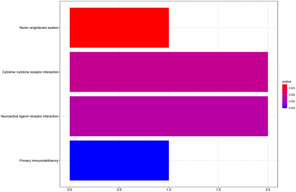 To outline the potential functions of the prognostic genes, we performed a functional enrichment analysis of the 14 prognostic genes. The results of gene ontology (GO) term enrichment analysis suggested strong correlations of these genes with immune responses (Figure 7). Kyoto encyclopedia of genes and genomes (KEGG) pathway analysis revealed the significant enrichment of four pathways. In particular, we detected that ZAP70 was enriched in primary immunodeficiency, TNFRSF4, and CXCL5 were enriched in cytokine-cytokine receptor interaction, CTSG was enriched in the renin-angiotensin system, and the CHRM2 and CTSG were enriched in neuroactive ligand-receptor interaction (Figure 8). These results further illustrated that the two pathways derived from the KEGG analysis were associated with immune responses.