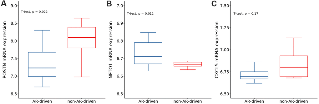 To explore the correlations between AR and the identified genes, we compared the expression of genes in the AR- and non-AR-driven groups using the GEO dataset (GSE101607). Our results showed that POSTN was significantly overexpressed in non-AR compared with AR-driven samples (Figure 9A), consistent with the findings of Cattrini et al. [26]. NETO1 was overexpressed in AR-driven samples (Figure 9B). Although we did not detect any association between the expression of CXCL5 and AR (Figure 9C), AR signaling has been reported to promote PRAD progression via modulation the AKT-NF-κB-CXCL5 signaling [10].