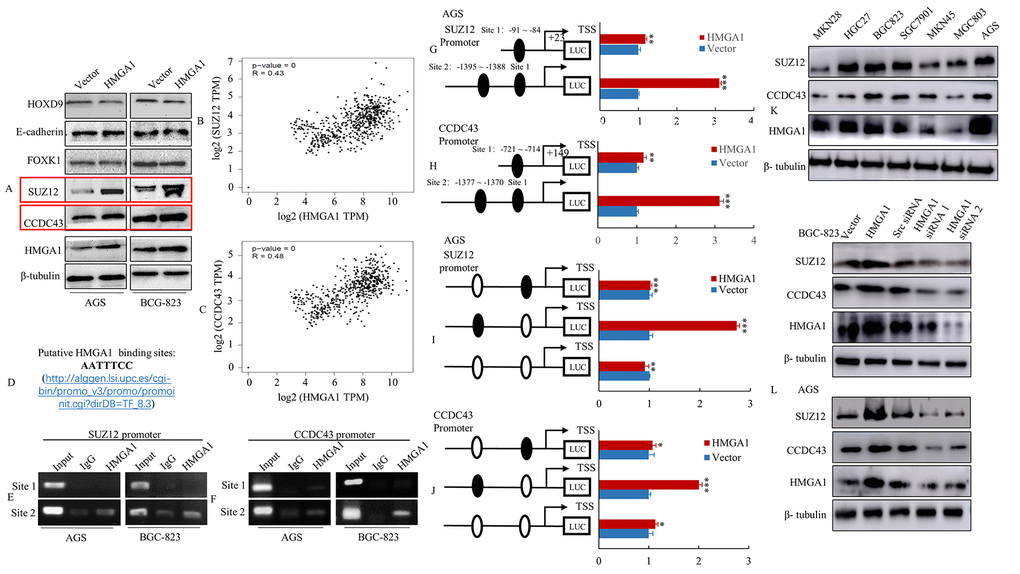 To verify the relationship between SUZ12 and HMGA1 or CCDC43 and HMGA1, the expression of SUZ12, CCDC43 and HMGA1 was tested in GC cell lines. The data indicated the levels of protein in SUZ12 and HMGA1 or CCDC43 and HMGA1 were positively link in the majority of these GC cell lines (Figure 2K). Further, overexpression of HMGA1 up-regulated SUZ12 and CCDC43 expression, whereas the knockdown of HMGA1 decreased SUZ12 and CCDC43 levels in BGC-823 and AGS cells (Figure 2L). These data implied that SUZ12 and CCDC43 are direct transcriptional targets of HGMA1.