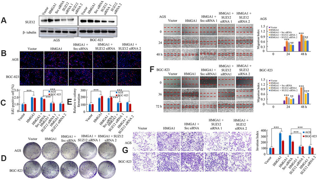 Next, we determined whether SUZ12 take part in HMGA1-mediated proliferation and metastasis. SUZ12 was downregulated by using siRNA in HMGA1-overexpressing cells, and the effect was verified by western blot (Figure 3A). We observed that the overexpression of HMGA1 enhanced the capability of GC cell proliferation by EdU incorporation and colony formation assays. On the contrary, downregulation of SUZ12 decreased HMGA1-mediated proliferation of AGS and BGC-823 cells (Figure 3B–3E). Furthermore, the up-regulation of HMGA1 significantly enhanced the migration and invasion of GC cell, while the down-regulation of SUZ12 aborted the declined migration and invasion abilities stimulated by HMGA1 overexpression (Figure 3F, 3G). Therefore, SUZ12 is necessary for HMGA1-mediated GC growth and metastasis.