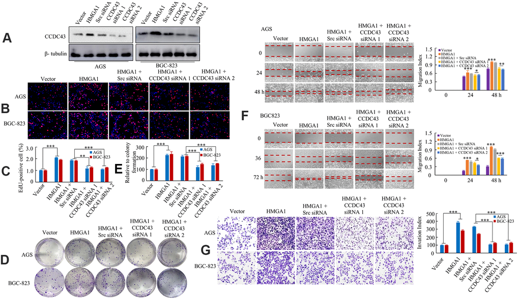 Similarly, we treated the AGS and BGC-823 cells expressing CCDC43 in HMGA1-overexpressing cells with CCDC43 siRNA 1 and 2. As expected, compared with control siRNA, CCDC43-siRNA decreased the CCDC43 expression by western blot (Figure 4A). We observed that HMGA1 overexpression promoted GC proliferation, while knockdown of CCDC43 was exhibited a negative effect on HMGA1-induced DNA synthesis using an EdU incorporation assay (Figure 4B, 4C). The ectopic expression of HMGA1 increased GC cell growth, whereas CCDC43 downregulation decreased the HMGA1-mediated proliferation of AGS and BGC-823 cells, as shown using a colony formation assay (Figure 4D, 4E).
