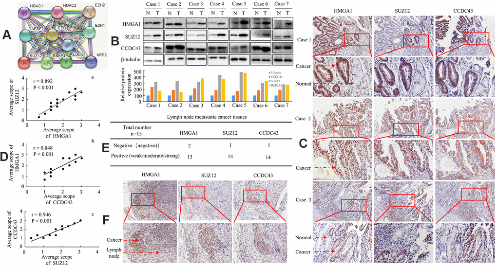 Then, the expressional levels of three genes in regional lymph nodes related with metastasis were tested as well. In total, 13/15, 14/15 and 14/15 of the metastatic tissues taken from lymph nodes highly expressed HMGA1, SUZ12 and CCDC43 by means of IHC, as exemplified in one patient (Figure 5E, 5F). Thus, overexpression of HMGA1, SUZ12 and CCDC43 is associated with enhanced regional lymph node metastasis in human GC.