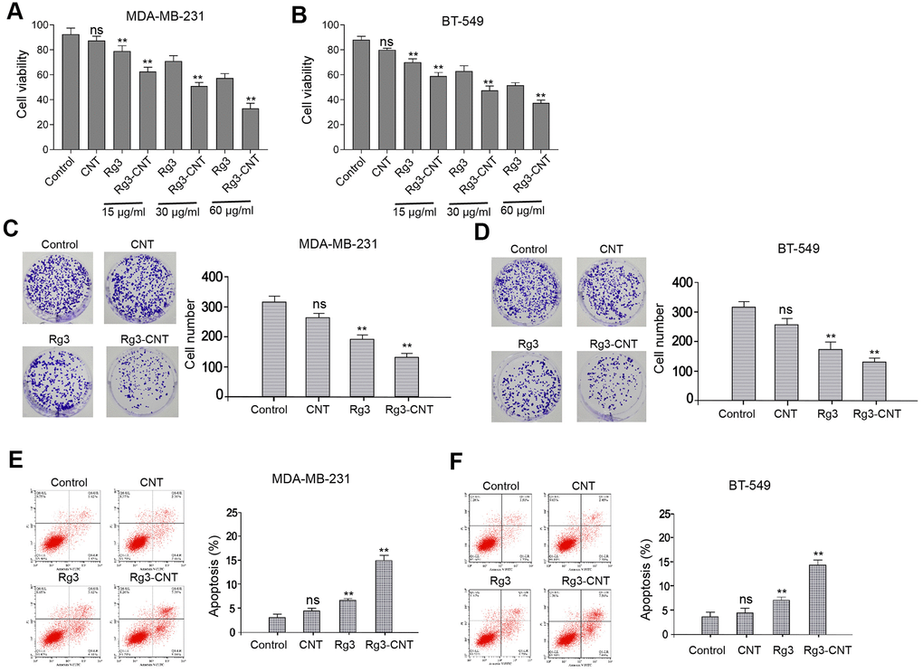 To measure the functions of Rg3-CNT in TNBC, MDA-MB-231 and BT-549 cells were treated with CNT, Rg3, or Rg3-CNT. Our data showed that the treatment of Rg3, but not CNT, inhibited the cell viabilities of MDA-MB-231 and BT-549 cells, in which Rg3-CNT further enhanced this effect in the system (Figure 1A, 1B). Similarly, colony formation of MDA-MB-231 and BT-549 cells was reduced by Rg3 while Rg3-CNT could reinforce its effect in the cells (Figure 1C, 1D). Moreover, the treatment of Rg3 induced apoptosis of MDA-MB-231 and BT-549 cells, in which Rg3-CNT treatment further increased the phenotype in the cells (Figure 1E, 1F). The similar results were observed in MDA-MB-468 cell lines (Supplementary Figure 1), suggesting that Rg3-CNT inhibits proliferation and induces apoptosis of TNBC cells.