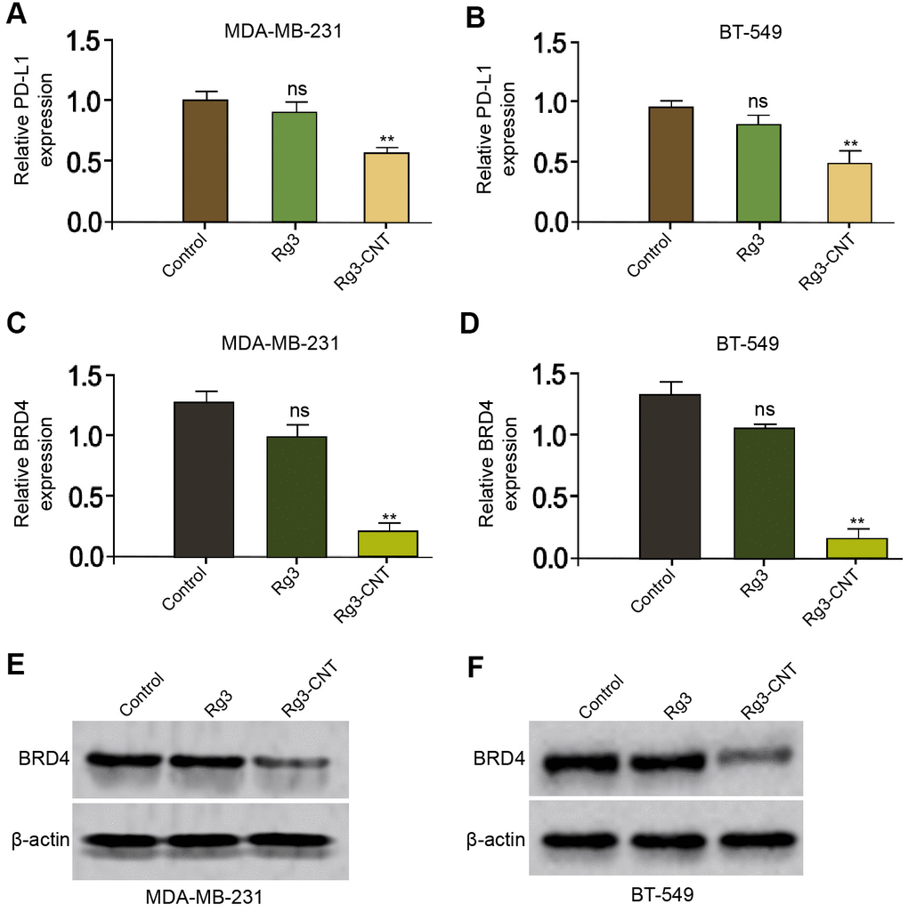It has been reported that Rg3 inhibits cisplatin resistance by repressing PD-L1 lung cancer and the inhibition of BRD4 attenuates PD-L1 expression in breast cancer [29, 30]. Next, we were interested in the effect of Rg3-CNT on BRD4 and PD-L1 in breast cancer cells. For this purpose, the MDA-MB-231 and BT-549 cells were treated with Rg3 or Rg3-CNT. Interestingly, the treatment of Rg3 failed to affect the expression of PD-L1 in the MDA-MB-231 and BT-549 cells, but the treatment of Rg3-CNT remarkably reduced the expression of PD-L1 in the system (Figure 2A, 2B). Meanwhile, the treatment of Rg3 was not able to inhibit the expression of BRD4 in the MDA-MB-231 and BT-549 cells, while the treatment of Rg3-CNT significantly down-regulated the mRNA and protein levels of BRD4 in the cells (Figure 2C–2F). The similar results were observed in MDA-MB-468 cell lines (Supplementary Figure 2).