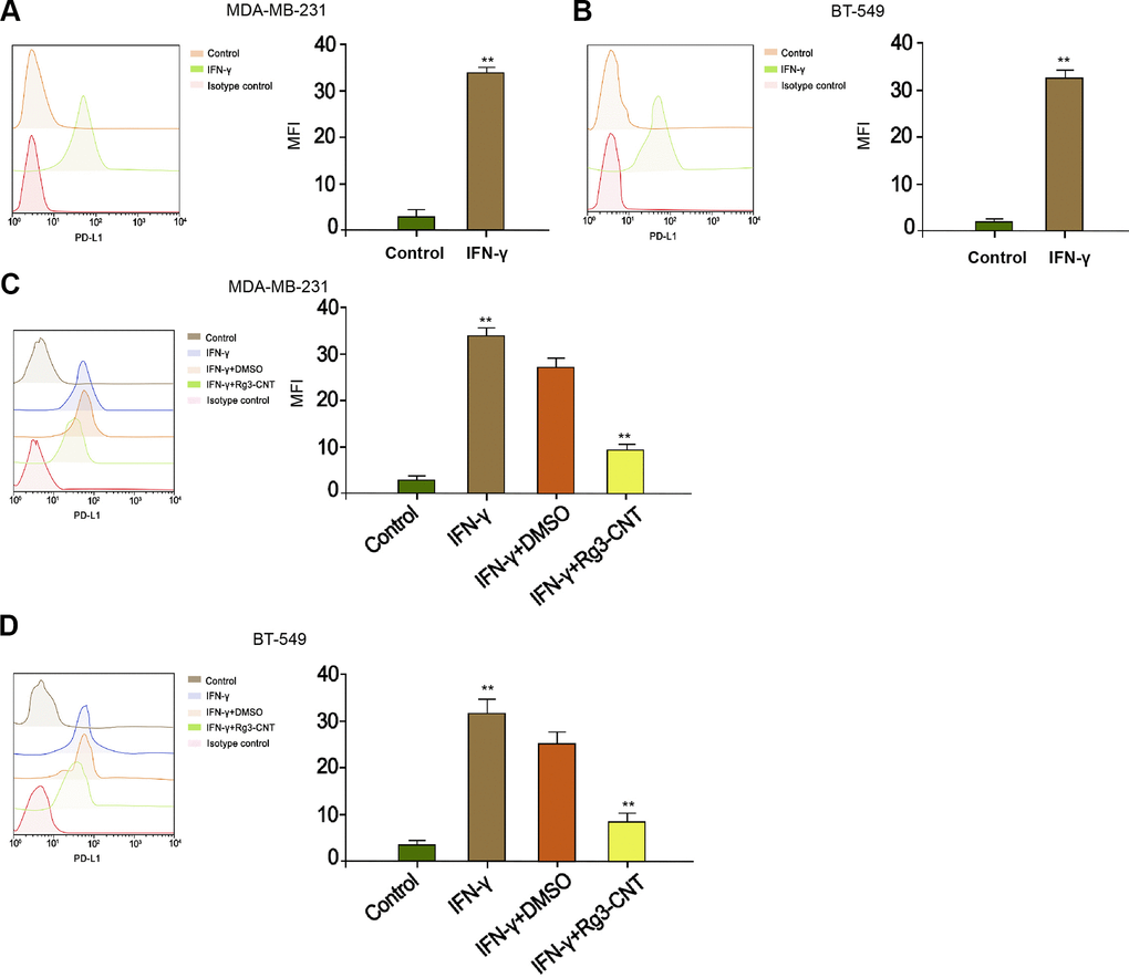 Given that interferon-γ (IFN-γ) was a strong inducer of PD-L1, we further explored the effect of Rg3-CNT on IFN-γ-mediated PD-L1 expression. As expected, the treatment of IFN-γ significantly enhanced the expression of PD-L1 in the MDA-MB-231 and BT-549 cells (Figure 3A, 3B). Meanwhile, the MDA-MB-231 and BT-549 cells were treated with IFN-γ or co-treated with IFN-γ and Rg3-CNT. Significantly, we observed that Rg3-CNT notably reversed the IFN-γ-induced PD-L1 in the cells (Figure 3C, 3D).