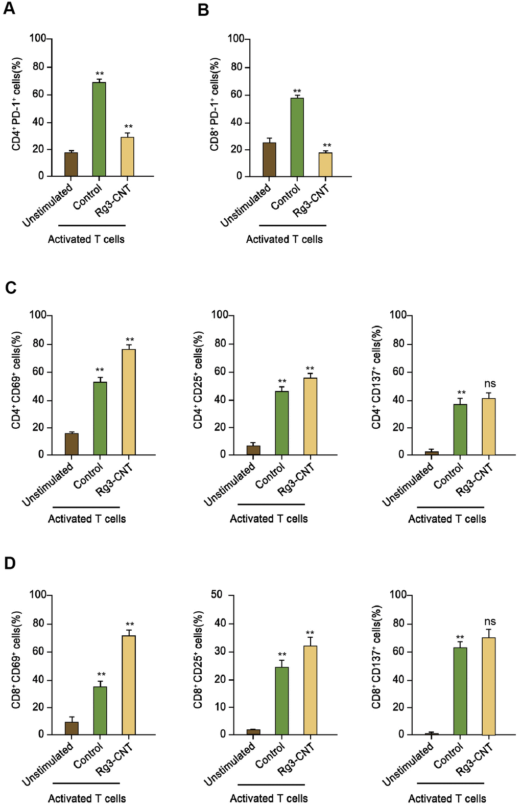 Next, we further evaluated the impact of Rg3-CNT on the PD-1 in activated T cells. Remarkably, PD-1 was enhanced in activated T cells (Figure 4A, 4B). Consistently, the treatment of Rg3-CNT significantly stimulated the population of CD4+ and CD69+, CD25+, and CD137+ T cells (Figure 4C). Similarly, the CD8+ and CD69+, CD25+, and CD137+ T cells were induced by treatment of Rg3-CNT in the system (Figure 4D).