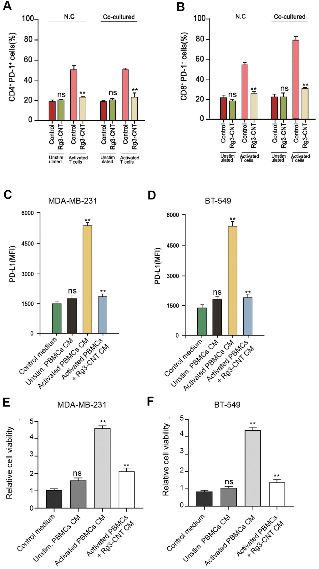 Given that we identified that PD-L1 and PD-1 were both regulated by B Rg3-CNT, we sought to explore the underlying influence by applying the co-culture system of T cell/triple-negative TNBC cells. Significantly, Rg3-CNT reduced PD-1 expression in the activated T cells (Figure 5A, 5B). Moreover, conditioned medium of unstimulated PBMCs failed to regulate PD-L1, while medium of activated PBMCs increased PD-L1 expression in the MDA-MB-231 and BT-549 cells, in which the treatment of Rg3-CNT could significantly block this phenotype in the system (Figure 5C, 5D). In addition, activated PBMCs enhanced the cell proliferation while the treatment of Rg3-CNT was able to reduce the effect in MDA-MB-231 and BT-549 cells (Figure 5E, 5F).
