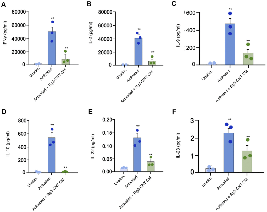 Furthermore, we found that the levels of IFN-γ, interleukins-2 (IL-2), IL-9, IL-10, IL-22, and IL-23 were stimulated in the activated T cells, in which the treatment of Rg3-CNT was able to reverse this effect in the system (Figure 6A–6F).