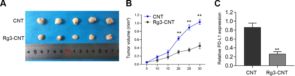 We then evaluated the influence of Rg3-CNT on the TNBC cell growth in vivo. Tumorigenicity assays revealed that Rg3-CNT remarkably attenuated cell growth of TNBC in the nude mice (Figure 7A, 7B). Importantly, the expression of PD-L1 was inhibited by the treatment of Rg3-CNT in the tumor tissues from the mice (Figure 7C).