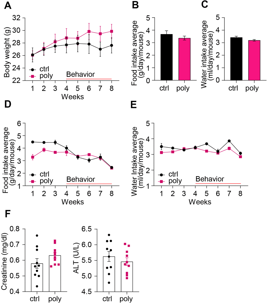 In this study, female mice were administered the same polypharmacy regimen, containing aspirin, paracetamol, simvastatin, metoprolol and citalopram, with the aim of investigating the effects of multi medications in female animals and allow comparison with our previous study in young adult male mice [19]. Animals were fed with the polypharmacy diet and then assessed for locomotor function and coordination, cognitive tests, and anxiety-like behavior. Hippocampal tissues were analyzed to measure any changes in protein markers which could be related to the behavioral outcomes observed in polypharmacy mice. The following parameters were monitored as basic health indices: food/water intake, body weight (BW), serum creatinine and alanine aminotransferase (ALT) levels.