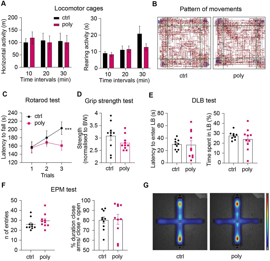 To explore whether the multiple-drug regimen could affect anxiety-like behavior we performed Dark/Light Box (DLB) and Elevated Plus Maze (EPM) tests. The results from DLB experiment showed that polypharmacy mice displayed a similar time spent in, and latency to enter, the lit compartment to the controls (Figure 2E). Likewise, EPM task did not reveal significant differences in the time spent by the animals exploring the close arms of the maze (about 80 % of the total trial duration: dot histogram in Figure 2F and heatmaps in Figure 2G).