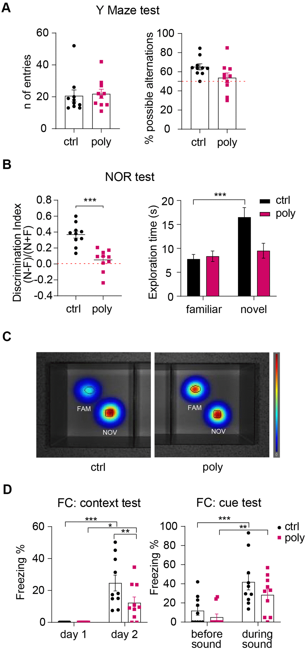 Fear conditioning (FC) test was performed to assess fear associated memory and learning. Mice were subjected to an auditive stimulus (cue) paired to a foot shock on day 1 and then tested for context and cue memory on day 2 and 3 respectively. The freezing % recorded during the habituation phase of day 1 (as a measure of baseline freezing) was compared to freezing % of day 2 to evaluate the context memory. To assess the cue memory, we measured the freezing % on day 3 before and during the sound stimulus. During the context test on day 2, both controls and treated animals showed a significantly increased freezing behavior compared to day 1 (Figure 3D, left graph). However, control mice responded to a greater extent to context recognition showing a significant higher freezing % than the polypharmacy ones (Figure 3D, left plot: **p=0.01, two-way ANOVA repeated measurements), indicating that the multi-medication treatment may affect FC contextual memory in young adult female mice. On day 3, we measured freezing % before and during the delivery of the acoustic stimulus; mice from control and polypharmacy administered group expressed a significantly stronger freezing behavior during cue application compared to before (Figure 3D, right graph), suggesting that both groups were able to associate the auditory cue to the adverse stimulus (the foot shock).