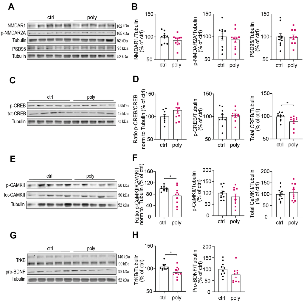 We performed western blot experiments on hippocampal tissue lysates and protein levels were quantified after separation by acrylamide gel electrophoresis (gradient 12-7.5 %) and transfer to a nitrocellulose membrane, as previously described [19, 72]. Membranes were incubated overnight at 4° C with the following primary antibodies: rabbit anti-phospho NMDA receptor 2A (1:250, Abcam), mouse anti- NMDA receptor 1 (1:2000, BD Bioscience), mouse anti- PSD95 (1:1000, Abcam), mouse anti-CREB (1:750, Cell Signaling) and rabbit anti-phospho CREB (1:1000, Cell Signaling), rabbit anti-CaMKII and rabbit anti-phospho CaMKII (1:1000, Cell Signaling), rabbit anti-TrkB (1:1000, Cell signaling), rabbit anti-BDNF (1:1000, Abcam) and mouse anti-alpha-tubulin (1:30000; Sigma-Aldrich, USA). Incubations with secondary antibodies were done for 2 hours at room temperature with anti-rabbit or anti-mouse immunoglobulin G (IgG) at 1:10000 dilutions (LI-COR Biosciences GmbH, Germany). Immunoreactivity was detected with LI-COR® Odyssey® system (LI-COR Biosciences, USA) by infrared fluorescence and quantified with ImageJ 1.48v software (NIH, MA, USA) by densitometry analysis of the immunoreactive bands.