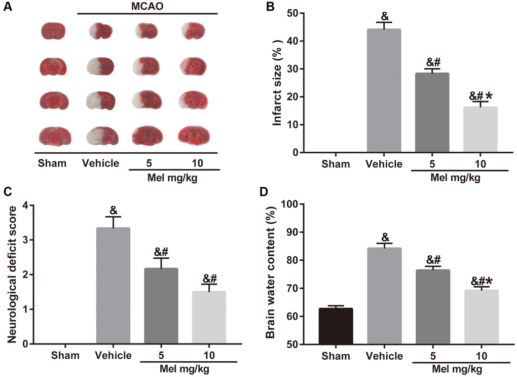 To examine whether melatonin has a neuroprotective effect in diabetic mice following CIR injury, we assessed neurobehavioral outcomes, cerebral infarct volume, and brain edema. Neurological scoring was performed 24 h after middle cerebral artery occlusion (MCAO). Then, the mice were killed and the brains were quickly isolated, sliced, and stained with TTC. The results showed that administration of melatonin (5 and 10 mg/kg) significantly reduced the cerebral infarct volume and neurological deficits compared with the vehicle group (Figure 1A–1C). Similarly, compared with the vehicle group, melatonin (5 and 10 mg/kg) also alleviated brain edema (Figure 1D). Additionally, the 10 mg/kg dose had the optimal protective effect and was selected for subsequent experiments. The results enabled us to believe that melatonin exerts neuroprotective effects in diabetes complicated with CIR injury.