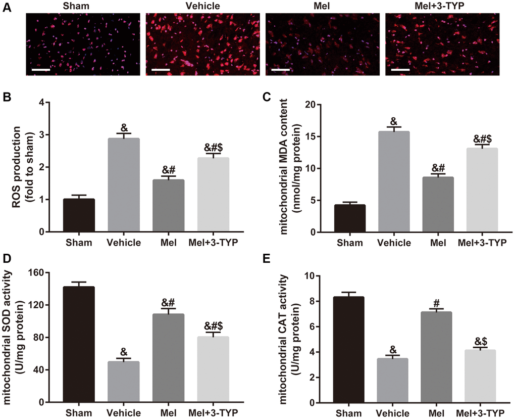 To determine the underlying mechanisms of melatonin on CIR in the diabetic state, we evaluated mitochondrial oxidative stress in our in vivo experiment. Since mitochondria are the main intracellular sources of ROS [12], we first measured ROS production in brain tissue The results showed that melatonin significantly reduced ROS level while the above effect was significantly weakened after the use of SIRT3 specific inhibitor 3-TYP (Figure 2A and 2B). Additionally, we evaluated mitochondrial malondialdehyde (MDA) content, superoxide dismutase (SOD) activity, and catalase (CAT) activity in these experimental groups. MDA is a frequently used membrane lipid peroxidation hallmark, while SOD and CAT are anti-oxidative enzymes that can remove free radicals produced during the metabolic process and reduce damage from oxygen free radicals [37]. As shown in Figure 2C–2E, melatonin effectively improved mitochondrial SOD and CAT activity, and reduced mitochondrial MDA generation. Consistently, 3-TYP also blunted these effects.
